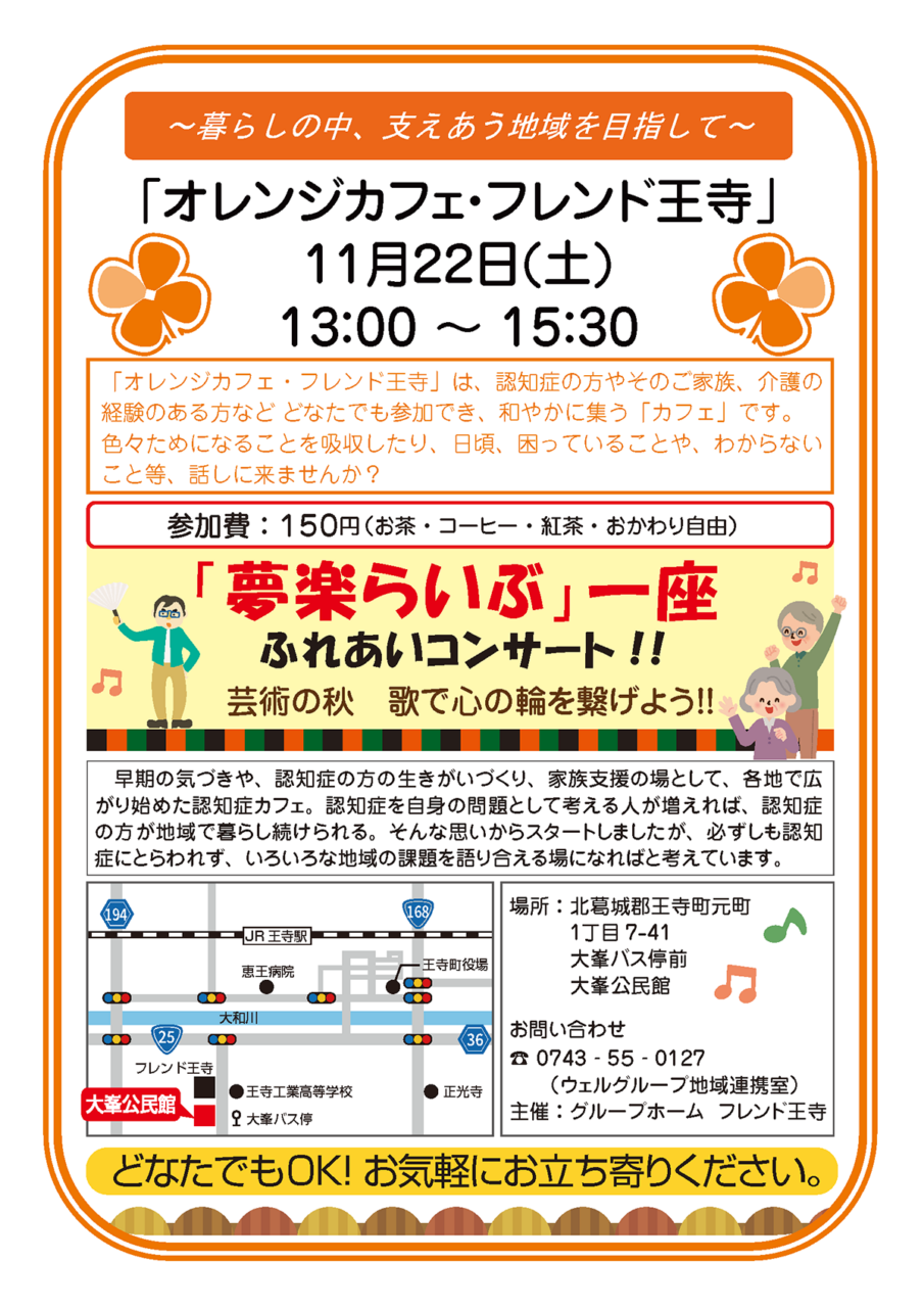 時間 | オレンジカフェ・フレンド王寺 | 13:00 ~ 15:30 | |
